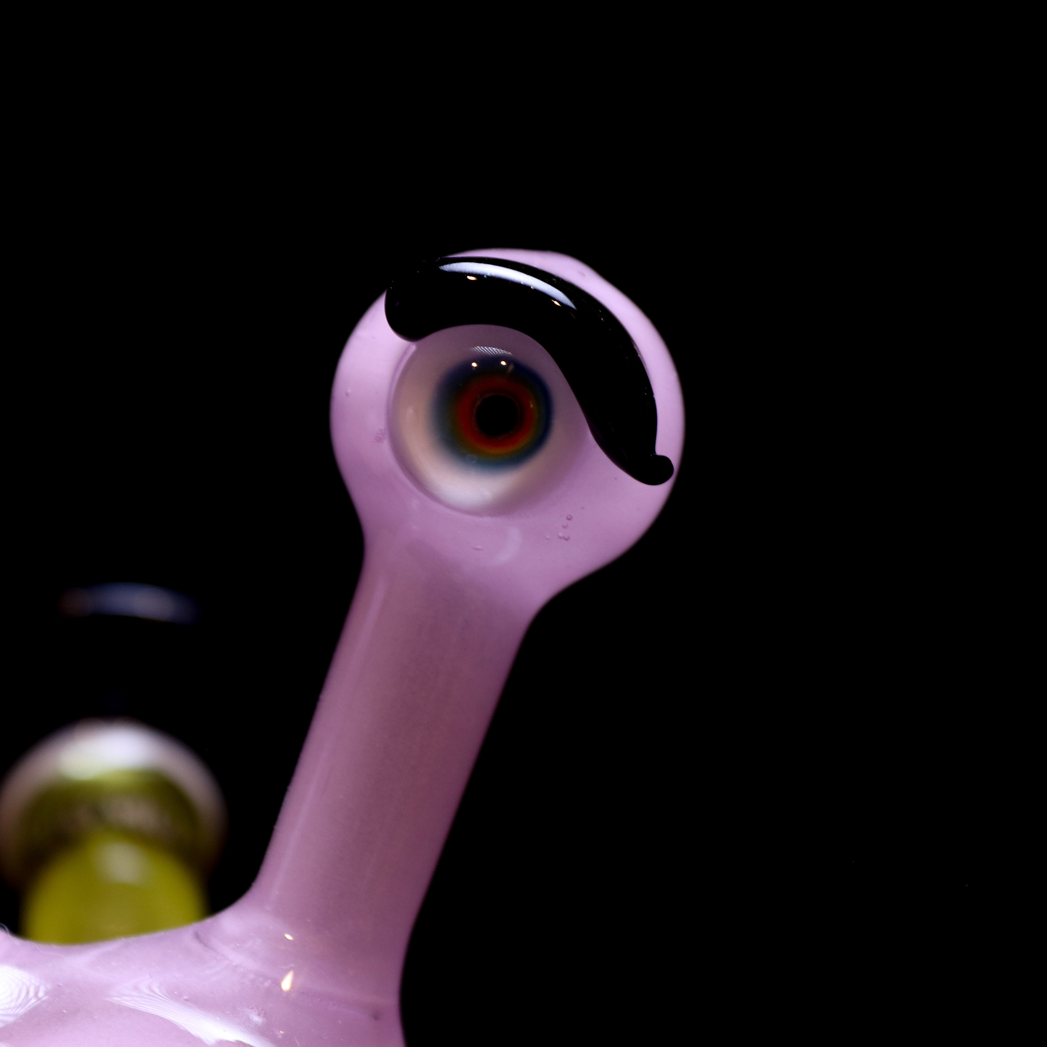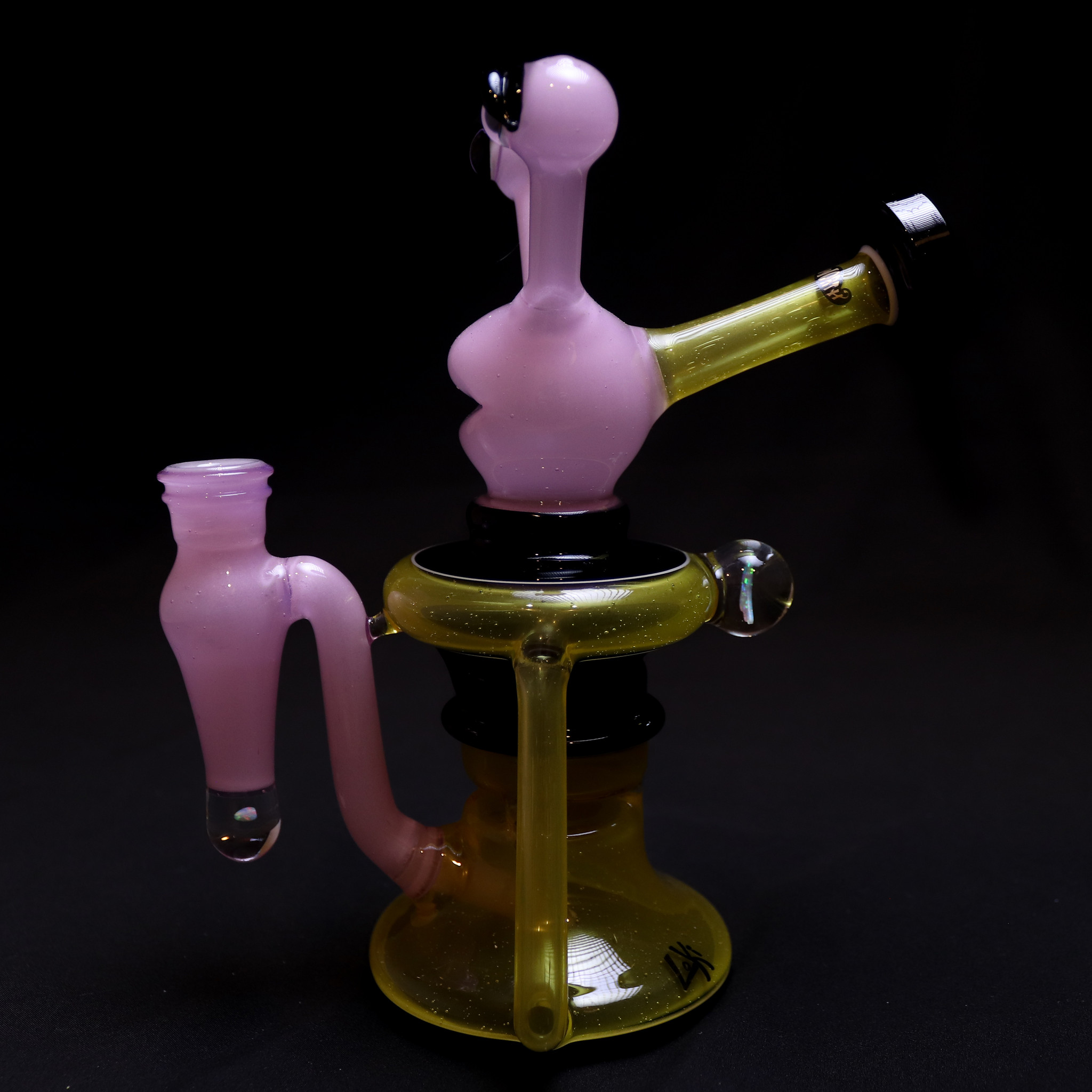 He started blowing glass in Fresno, California with soft glass for 3 years then went into borosilicate after he graduated college with a degree in business management. Slugworth has been working with borosilicate for the past 13 years bringing a unique spin on the functional glass art we have all grown so familiar with. Pulling inspiration from his son and in an attempt to separate himself from all the similar designs seen in rigs and water pipes he chose an aesthetic that features the iconic top hat shaping and color encalmos that truly set Slugworth Glass apart from the rest.